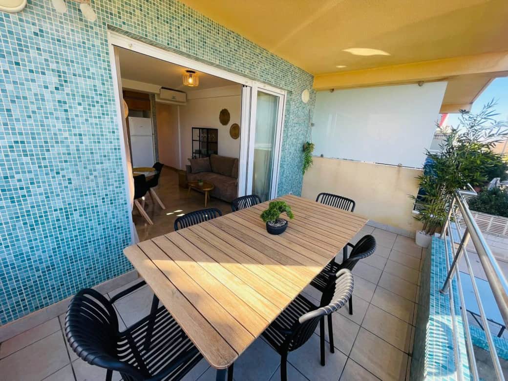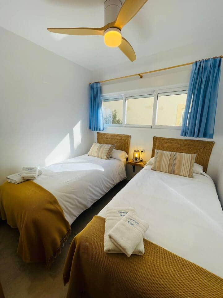 Precioso apartamento junto al mar con dos dormitorios, unos de matrimonio y otro con dos camas individuales. Además disponemos de sofá cama para poder hospedar hasta 6 huéspedes. Dos baños, uno de ellos con una amplia ducha, el otro de cortesía. Ubicado a primera línea de playa frente al paseo marítimo. Disponemos de dos apartamentos más en el mismo edificio, uno en la planta superior y otro en la planta baja, por si quieren reservar más de un apartamentos si se trata de un grupo grande.